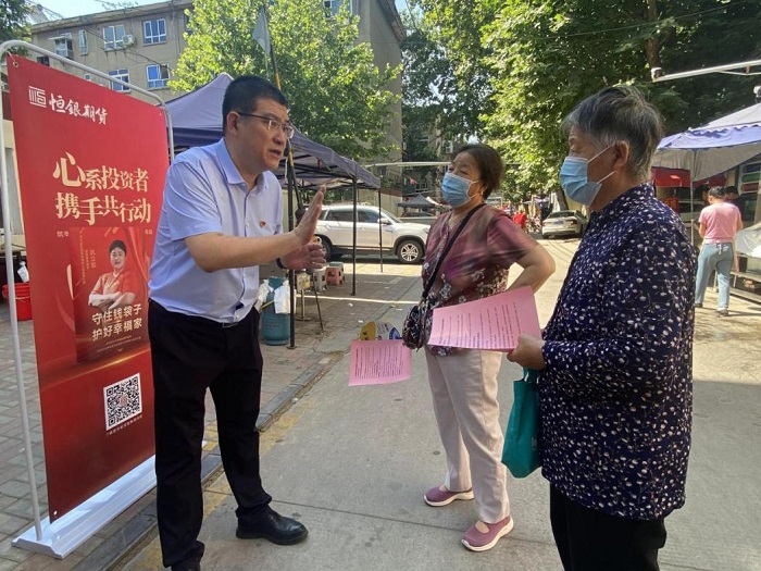 為進(jìn)一步深入貫徹落實(shí)處置非法集資部際聯(lián)席會(huì)議相關(guān)工作要求,根據(jù)河北省打擊和處置非法集資工作領(lǐng)導(dǎo)小組印發(fā)的《2023年防范非法集資宣傳月活動(dòng)動(dòng)作方案的通知》,2023年6月15日,國(guó)富投資集團(tuán)所屬恒銀期貨有限公司(以下簡(jiǎn)稱“恒銀期貨”)聯(lián)合東風(fēng)路派出所,由恒銀期貨總經(jīng)理湯志江、副總經(jīng)理張南組織公司各部門骨干力量深入社區(qū),開(kāi)展了防范非法集資的線下宣傳活動(dòng)。