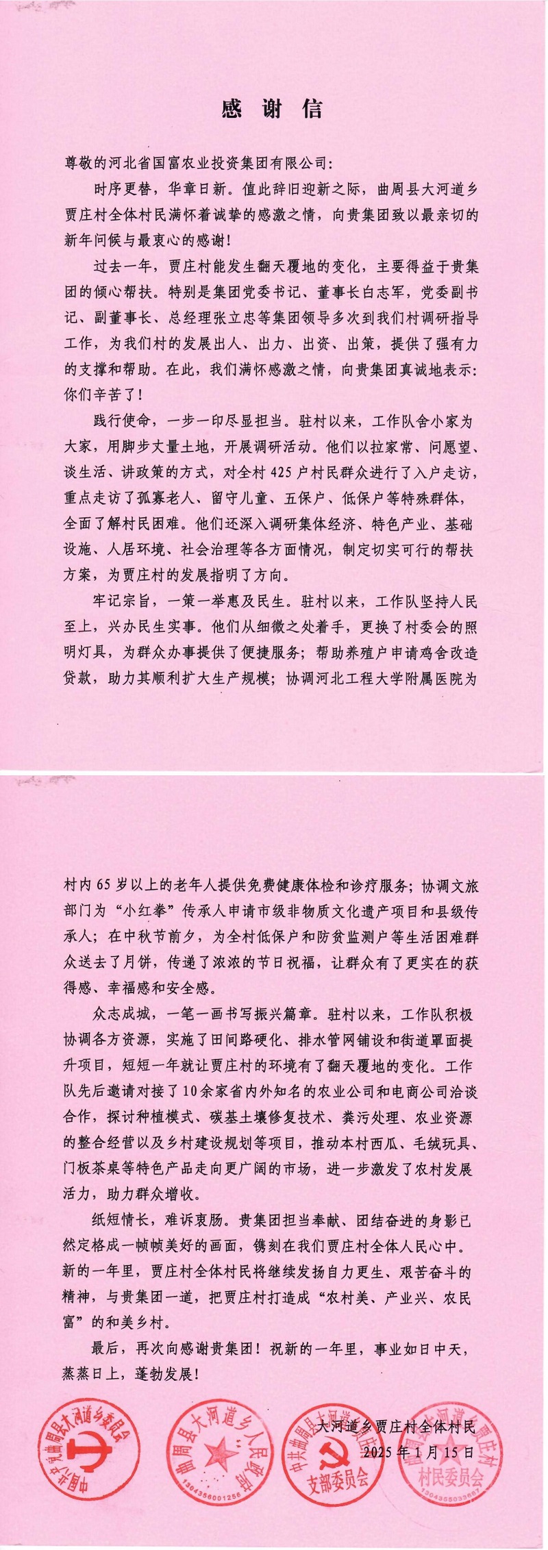 2024年,國富集團駐賈莊村下沉工作隊緊緊圍繞發(fā)展集體經(jīng)濟、推進鄉(xiāng)村振興的目標,深入學習中央政策方針及省市縣委組織部和集團黨委有關下沉工作要求,扎實開展駐村幫扶工作,經(jīng)過一年的努力,取得初步成效,同時也得到了曲周縣大河道鄉(xiāng)和賈莊村的認可,特給我集團送上錦旗和感謝信!